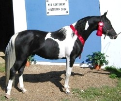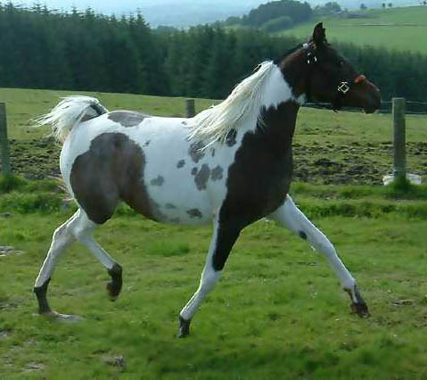 Dream is a pintabian mare carrying 99.6% arabian blood with the tobiano coat pattern, she is homozygous for tobiano and black, this means she will always produce a coloured foal and never produce a chestnut and white. She has a very kind nature and is an extravagent flambouyant mover standing approx 14.2hh. Dream has been covered (2007) with the well known bay pure arabian show stallion Ali Khan, (photos below) he was bred at Bychan Arabians , Llandeilo. We eagerly await Dreams first foal which will be 99.8% arabian and due in Feb 2008.