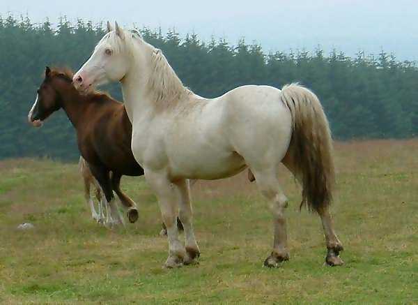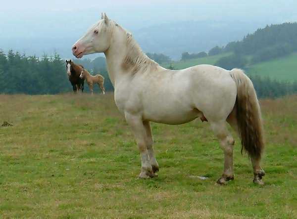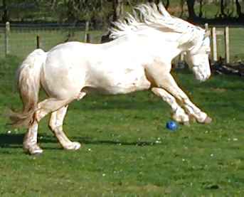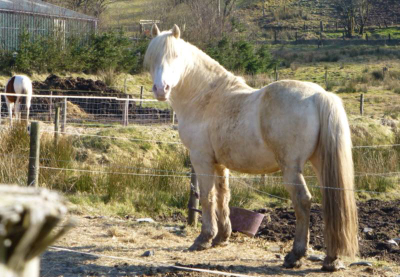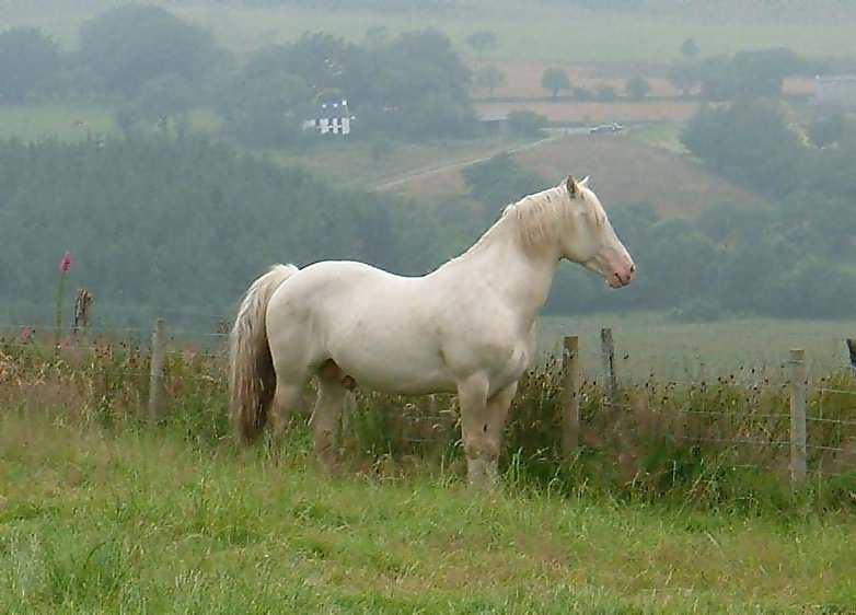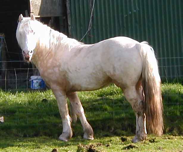 Terackie Winter Shadow is our young homebred cremello section D stallion He is by our palomino stallion (now gelded and sold) Deicin True Briton 42114 ( by Deicin King Flyer and out of Deicin Ladi Pride by Llanarth True Briton ), and out of our lovely palomino mare 97740 Aberlogin Polly ( by Thorneyside The Equalizer and out of Redfern Dolly by Gwendraeth Robert ap Frenin ) He now stands at about 14.2hh, his sire is 15.1hh and his dam 14.2hh. He is a real gentleman who will cover his mares in hand or will run out with the mares and foals as he does most years. We covered one mare with him in 1999 being Terackie Madam Xantia and she produced a very smart palomino colt foal who was sold by the time he was 3 days old. Winter has now proved himself to be a good stock getter time and time again and covers all our sec D and some sec A mares he is a consistent producer of good natured quality foals and really stamps his stock. Following photos taken July 2005